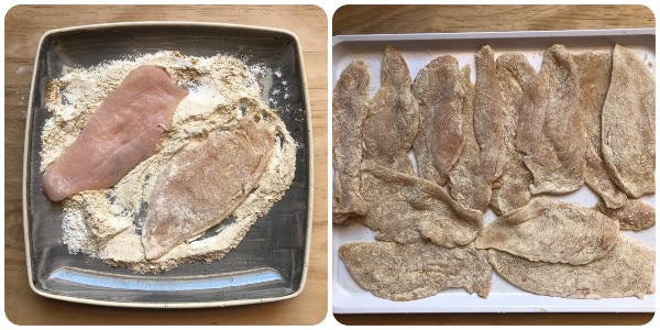 Passe as fatias de peito de frango na mistura, sacudindo levemente para retirar o excesso de farinha.