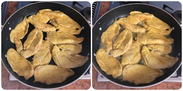 Em uma panela grande, derreta a manteiga antes de adicionar as fatias de frango enfarinhadas.