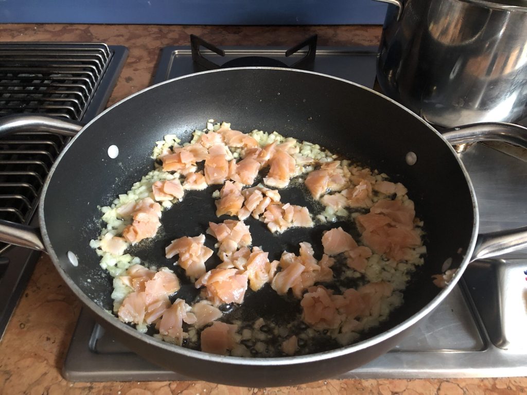 Deixe dourar por alguns instantes, depois adicione os pedaços de salmão.