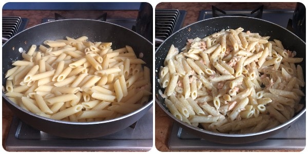 Enquanto isso, cozinhe as penne em bastante água salgada fervente; escorra-as al dente e transfira diretamente para a panela do molho, conservando algumas colheres de sopa da água de cozimento para usar caso seja necessário amolecer o molho. Misture bem para incorporar todos os ingredientes.