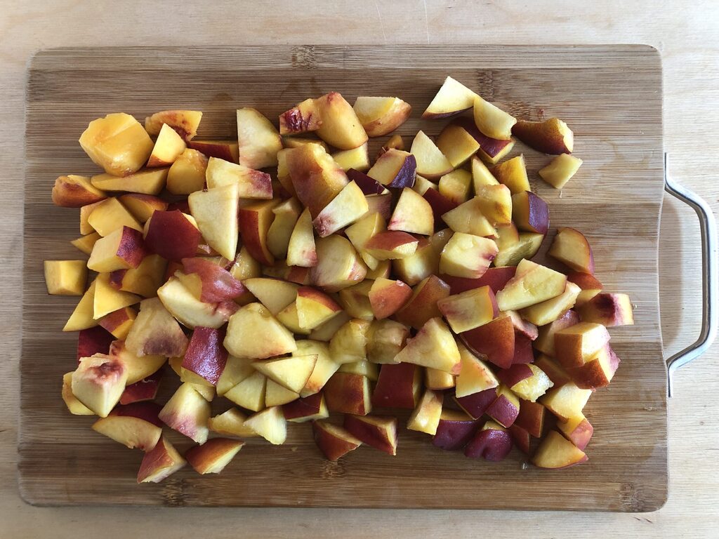 Lavar os pêssegos, secá-los com papel toalha e cortá-los em pedaços sem descascar.
