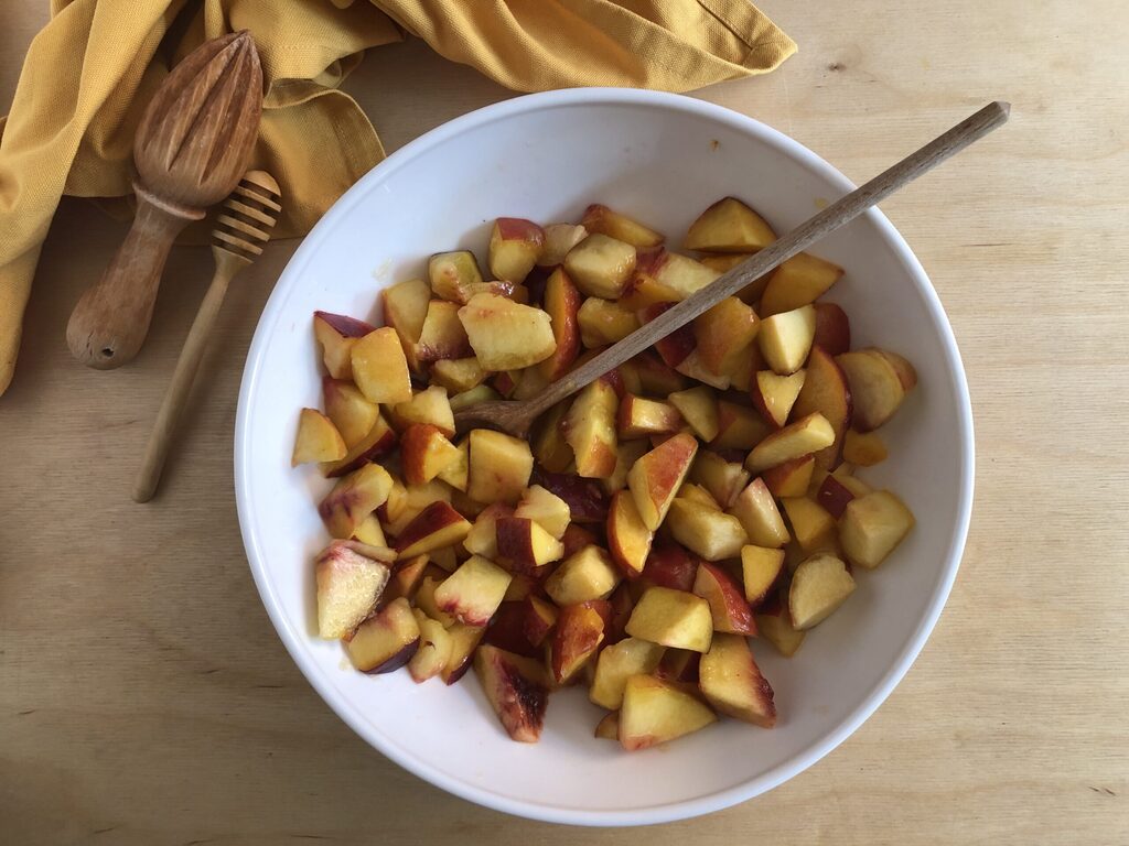 Transferi-los para uma tigela, adicionar o suco de limão, o mel e misturar delicadamente. Deixe os pêssegos descansarem enquanto prepara o crumble.