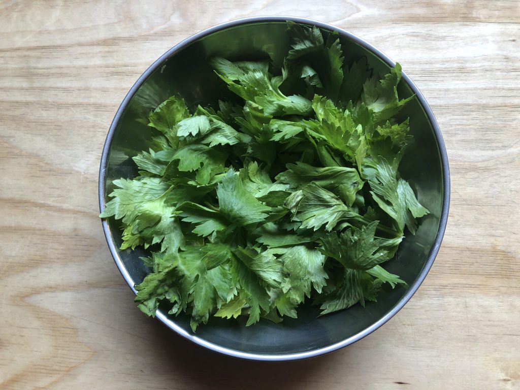 • Lavar muito bem as folhas de aipo e secá-las com uma centrífuga para salada.