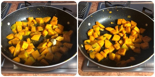 Em uma panela, aqueça algumas colheres de azeite e doure um dente de alho previamente descascado e retirado o miolo interno, depois adicione os pedaços de abóbora e algumas folhas de sálvia picadas com a tesoura e doure por 5/6 minutos, mexendo de vez em quando.