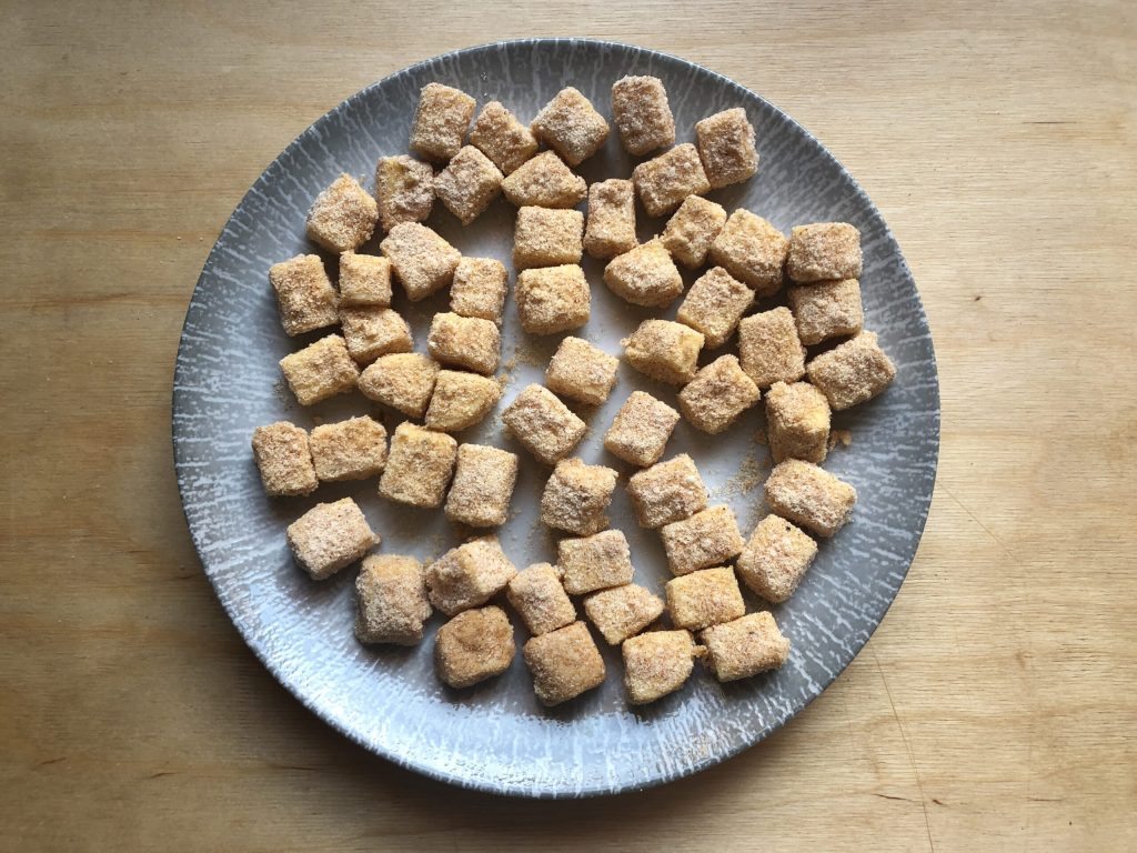 A seguir, passe os cubinhos de polenta primeiro no ovo e depois na empanagem. Para evitar umedecer a empanagem e desperdiçá-la, use uma mão para passar os cubinhos no ovo e a outra para cobri-los com a mistura seca: assim a empanagem permanecerá seca, você não precisará repô-la após poucos passados e trabalhará de forma mais limpa.