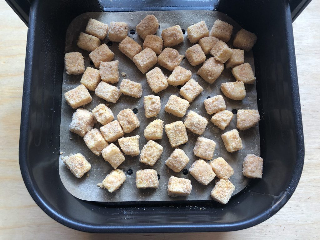 Preaqueça a Airfryer, coloque uma folha de papel-manteiga furado e disponha os petiscos de polenta em uma única camada. Por fim, borrife-os com óleo em spray. Se não tiver, regue com um fio leve de azeite de oliva.