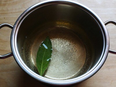 Em uma panela, coloque a água, o vinagre (veja NOTA), uma pitada de sal grosso e uma folha de louro (se preparar muitas pimentas em conserva, coloque duas) e leve para ferver.