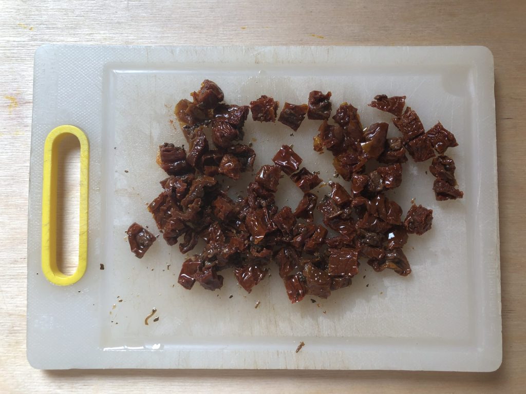 Escorra bem os tomates secos do seu óleo de conservação e corte-os em pedaços.