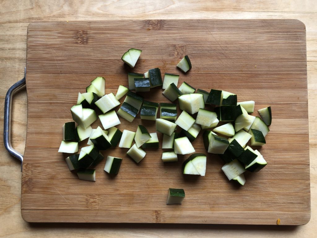 Corte as pontas das abobrinhas, lave-as e corte também em pedaços.