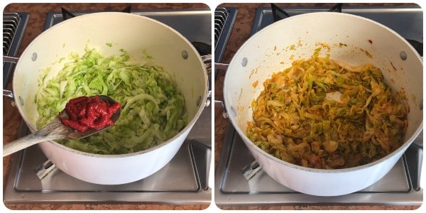• Deixe fritar por alguns instantes, depois adicione as tiras de repolho, uma generosa pitada de sal e deixe murchar por cerca de 10 minutos, mexendo de vez em quando.