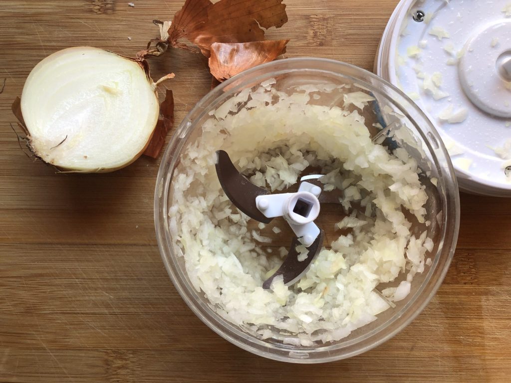 • Descasque a cebola e pique finamente. Nada mais de lágrimas se você usar um picador manual que é realmente muito prático. Se você deseja comprá-lo, pode encontrá-lo clicando AQUI.