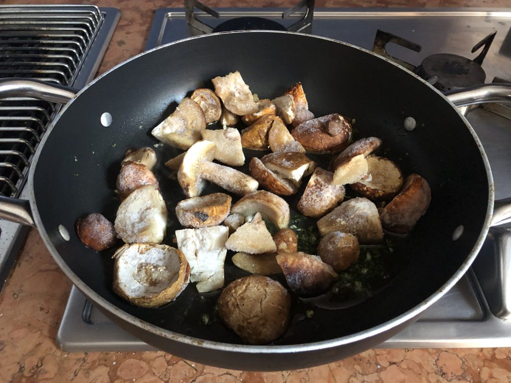 • Quando começar a chiar, adicione os cogumelos ainda congelados.