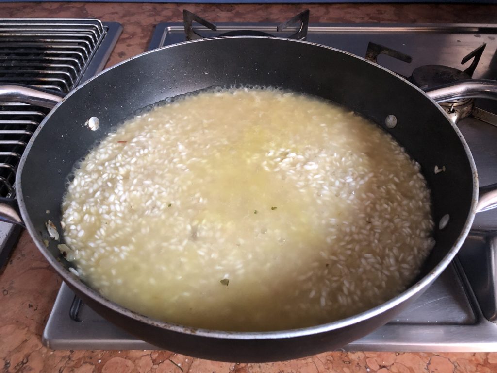 Neste ponto, se desejar, você pode finalizar o risoto com uma colher de manteiga e queijo ralado. Eu preferi não fazer isso, pois já estava cremoso.