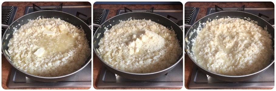 Quando estiver cozido, misture o risoto com uma noz de manteiga (ou mais, se desejar), o queijo ralado e ajuste o sal, se necessário.