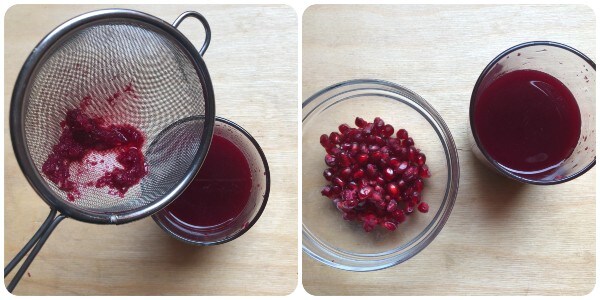 • Corte a romã ao meio, extraia 40/50 g de sementes inteiras, depois esprema as duas metades como se fossem laranjas: precisará de cerca de 150 ml de suco.
