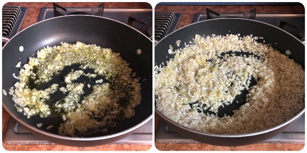 • Em uma panela grande, aqueça algumas colheres de azeite e frite a cebola echalote. Deixe fritar por alguns instantes, depois adicione o arroz e toste por 2/3 minutos, mexendo de vez em quando.