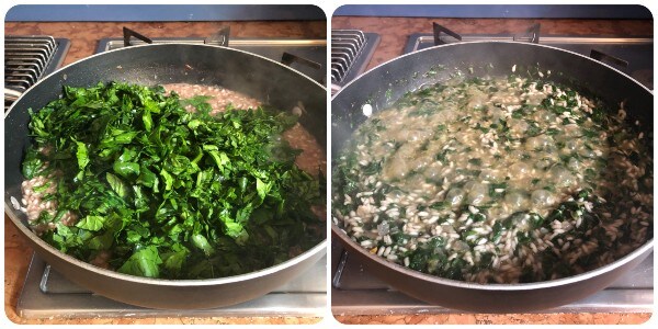 • Após alguns minutos, adicione também o espinafre e continue cozinhando, adicionando mais caldo conforme necessário.
