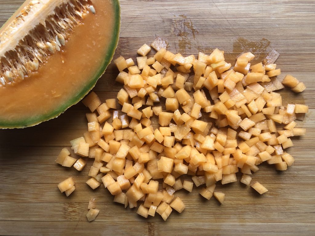 Primeiro, remova as sementes e a casca das fatias de melão e corte-as em cubinhos.