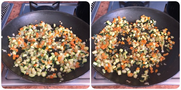Em uma frigideira, aquecer duas colheres de sopa de azeite e dourar a abobrinha e o mix para refogado por 3/4 minutos. Em seguida, temperar com sal e pimenta, desligar o fogo e deixar esfriar.