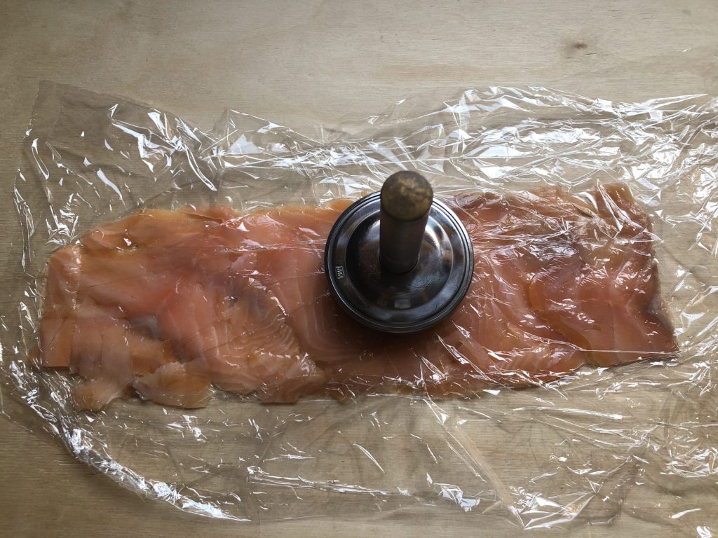 Estender uma folha de filme plástico e dispor as fatias de salmão lado a lado formando um retângulo: o meu mede 35 x 12 cm.
