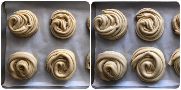 Transfira-o para uma assadeira forrada com papel manteiga e proceda da mesma forma para fazer os outros cinco rolinhos doces fermentados.