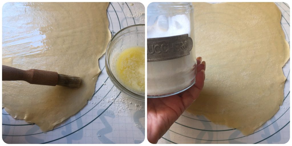 Pincele a folha com a manteiga derretida e polvilhe com açúcar. A manteiga sobrará. Guarde-a, pois ela será útil para pincelar os rolinhos após o cozimento.