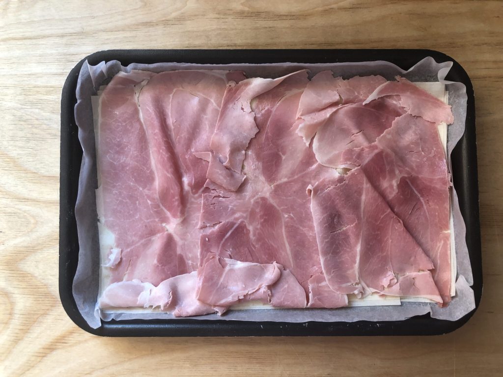Agora cubra a base com as fatias de presunto cozido previamente retiradas das eventuais partes gordurosas.