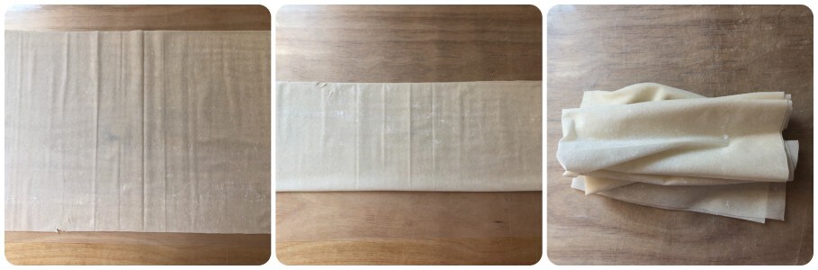 Pegue uma folha de massa filo, dobre-a ao meio no lado mais comprido e amasse como mostrado na fotografia.