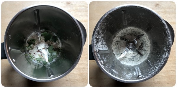 Coloque no copo do mixer as agulhas de alecrim, duas folhas de sálvia e uma pitada de pimenta (quantidade a gosto conforme o paladar pessoal). Adicione 30 g de farinha retirados do total e triture: com o Bimby, trabalhei por 20 segundos começando na velocidade 6 e chegando gradualmente à velocidade 9.