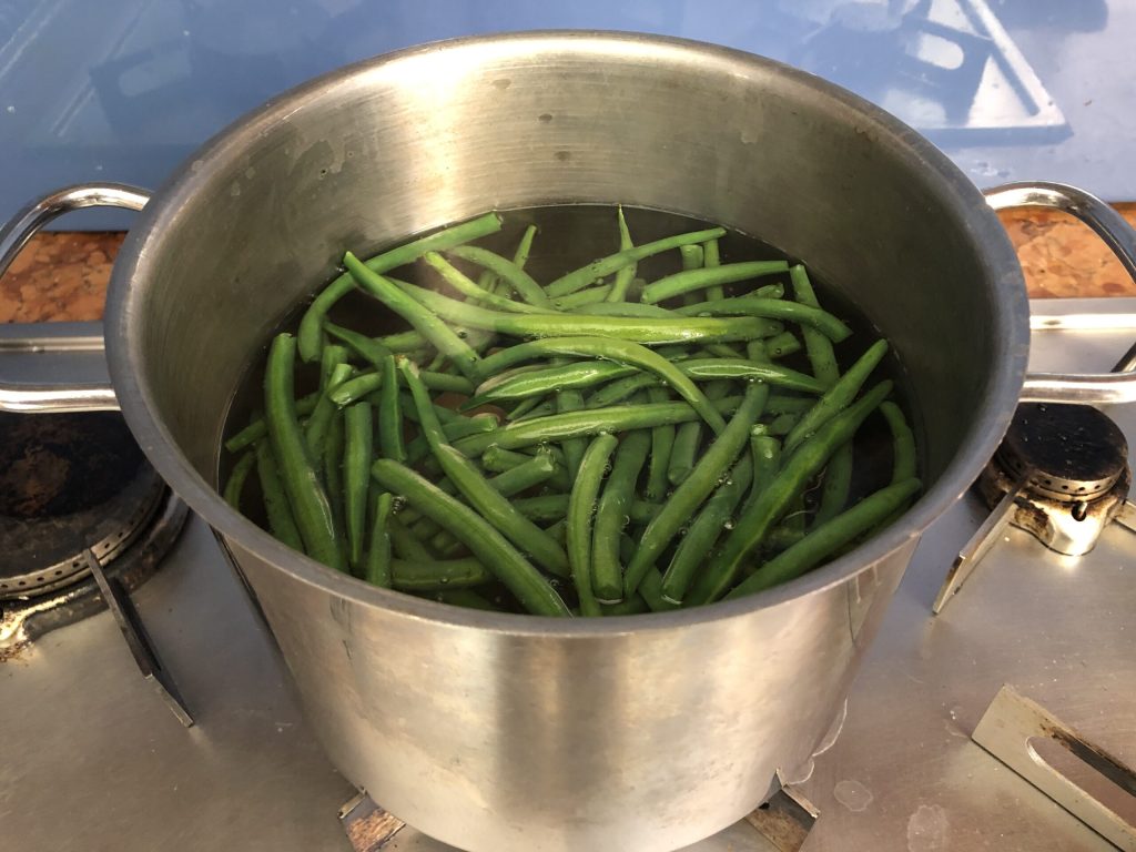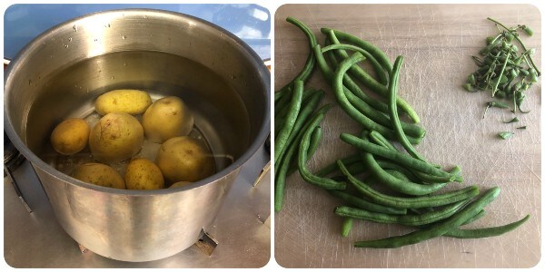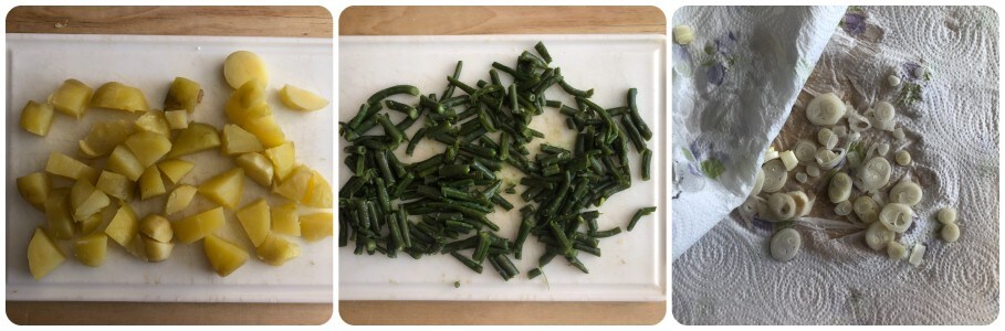 Uma vez prontas as batatas, escorrer com uma espumadeira e mergulhar na mesma água as vagens. Cozinhe até que fiquem macias. Se conseguir calcular bem o tempo de cozimento das batatas, também pode cozinhar os dois vegetais juntos. Eu não faço isso porque sempre corro o risco de um estar menos cozido que o outro.
