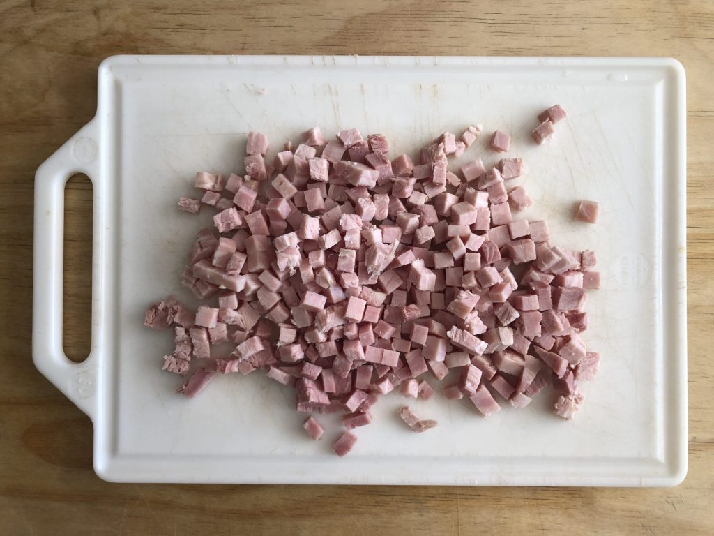 Cortar o presunto cozido em cubos.