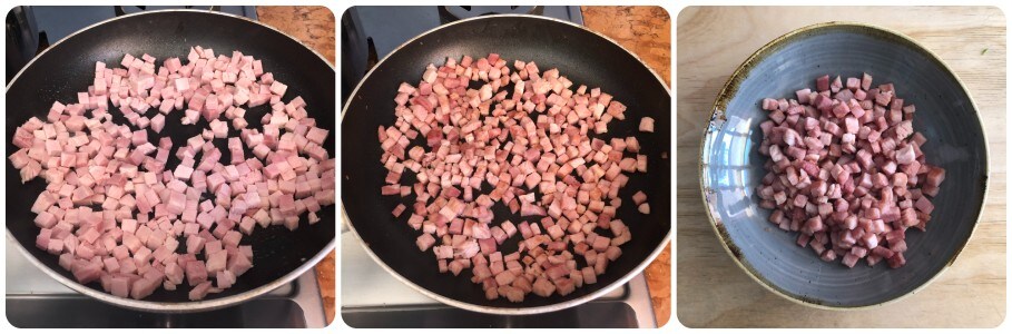 Em uma frigideira, aquecer um fio de azeite e dourar os cubos de presunto até ficarem dourados. Depois, retire da frigideira e reserve.
