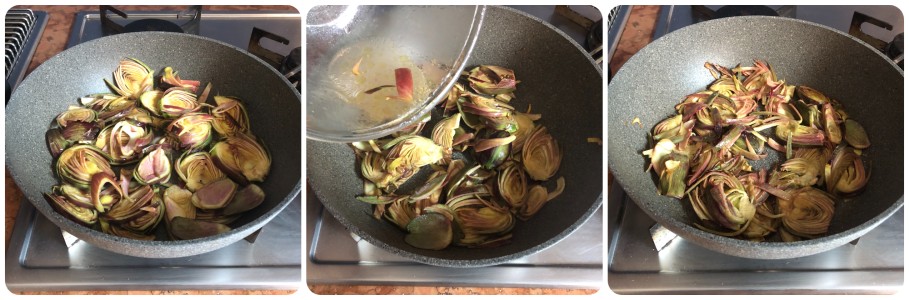Passado esse tempo, aqueça muito bem uma panela com um fio de azeite. Transfira as alcachofras com toda a marinada e salteie rapidamente por 5/6 minutos em fogo médio-alto, mexendo delicadamente. Ao final, ajuste o sal, se necessário.