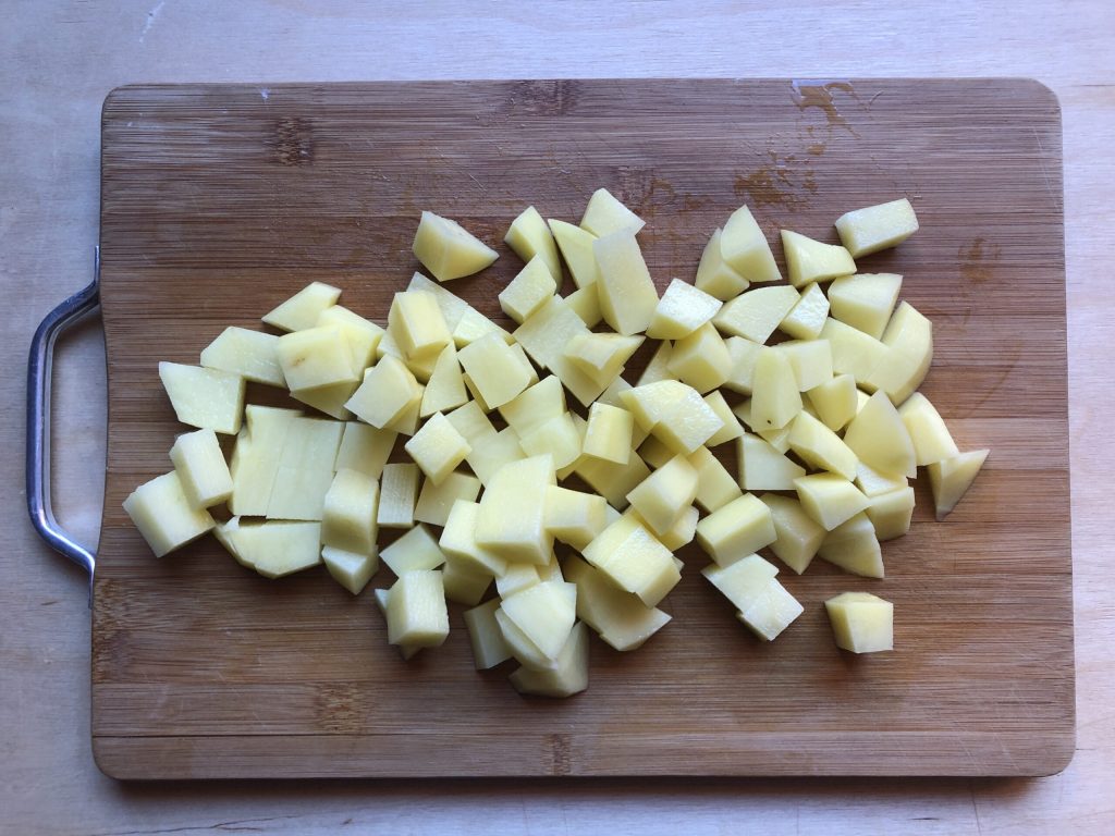 • Enquanto isso, descasque as batatas, lave-as e corte em cubinhos.