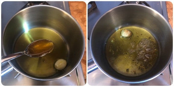 Em uma panela pequena, aqueça por 3/4 minutos em fogo bem baixo o azeite e o dente de alho descascado.