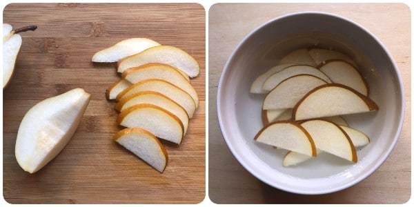 Lave a pera, retire o cabinho e o miolo e, sem descascá-la, corte-a em fatias finas e mergulhe-as aos poucos em água acidulada com suco de limão.