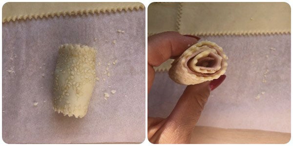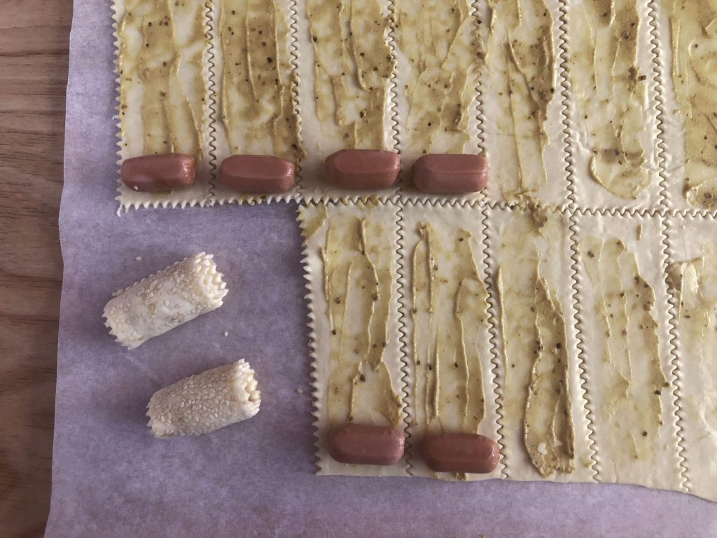 Coloque a mini salsicha na extremidade da tira e enrole. Voilá! Como você pode ver, de cada tira se obtêm dois salgadinhos.