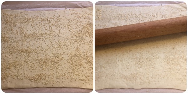 Desenrole o retângulo de massa folhada, mantendo-o apoiado no papel manteiga fornecido na embalagem, polvilhe com sementes de gergelim e passe o rolo de massa por cima para que adiram bem à massa.