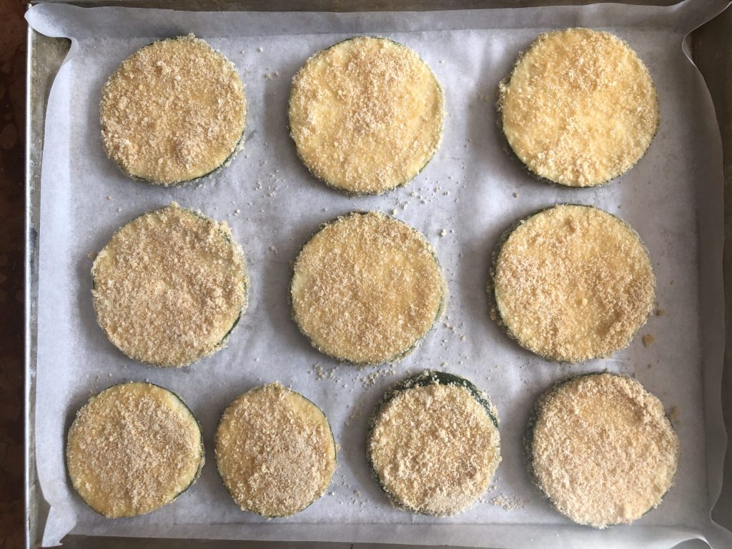 Passe cada fatia de abobrinha primeiro nas farinhas, depois no ovo e, por último, no pão ralado.