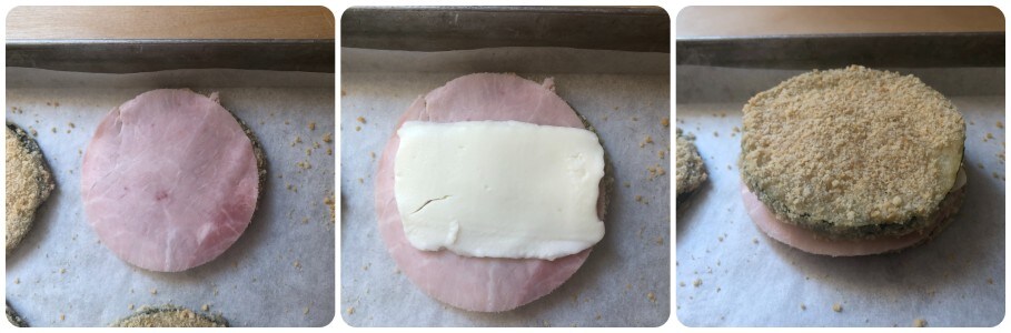 Após assar, recheie uma fatia de abobrinha com um pedaço de presunto cozido, coloque uma fatia de scamorza por cima e feche o sanduíche com outra fatia de abobrinha. Tente combinar fatias do mesmo tamanho. Cortei o presunto com um cortador para obter um círculo do mesmo tamanho, mas não é absolutamente necessário.