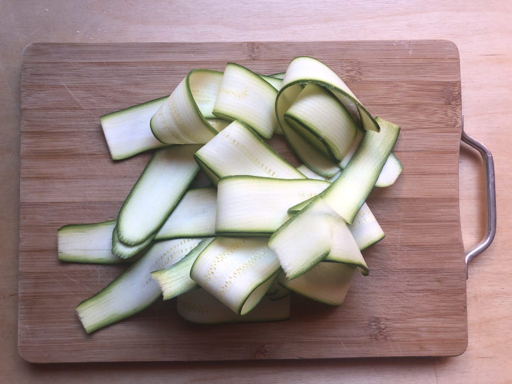 Corte as pontas da abobrinha (usei uma grande), lave-a e corte em fatias finas no sentido do comprimento com uma mandolina.