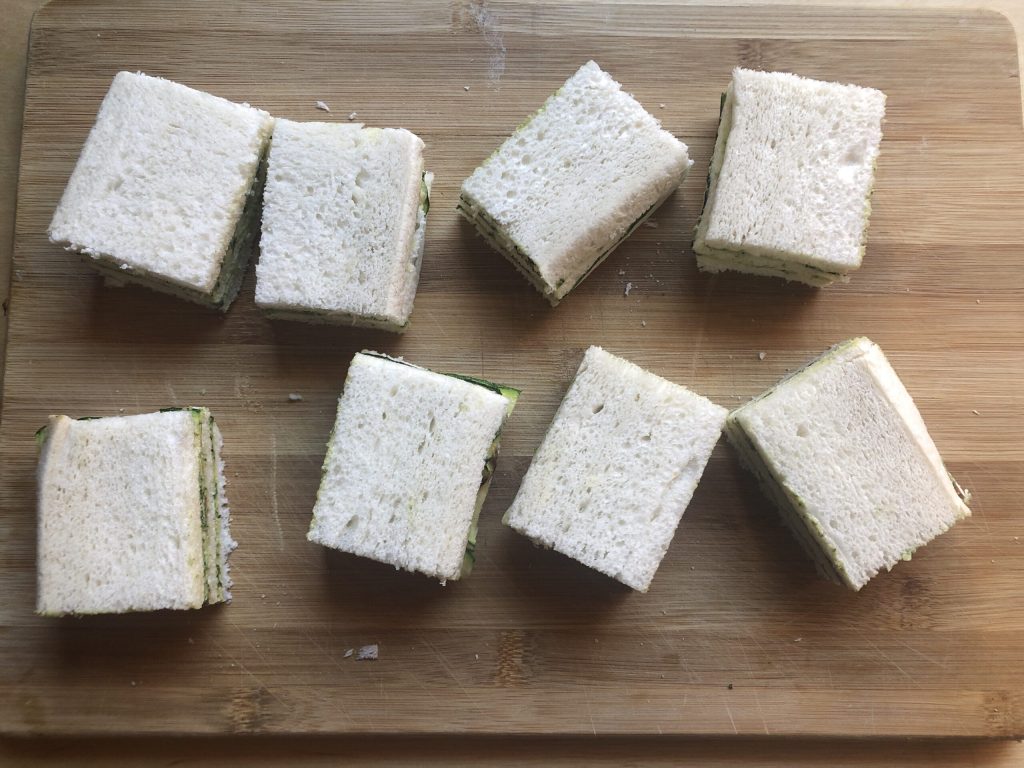 Meu retângulo de pão mediu 24 cm por 10. Assim, obtive pequenos retângulos de 6 cm × 5. Oito sanduíches para cada retângulo; 16 sanduíches no total. Se preferir, você pode cortar cada retângulo em dois pequenos triângulos. Eu fiz isso com alguns.