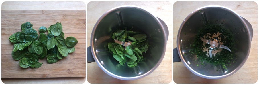 Lave bem o espinafre, seque-o com um pano de prato ou papel toalha e coloque no copo do mixer. Triture finamente por 5 segundos na velocidade 7. Recolha o triturado para o centro do copo e triture novamente por 3 segundos na velocidade 7. Repita uma terceira vez sempre por 3 segundos na velocidade 7.