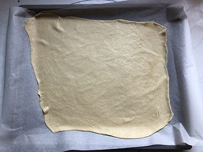 Adicione mais sêmola se necessário e estenda a massa bem fina com o rolo. Não é necessário dar uma forma precisa; o importante é que caiba na assadeira.