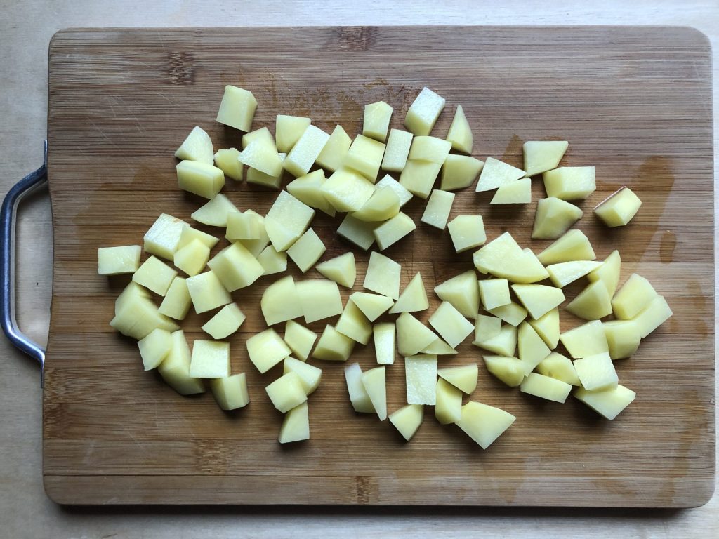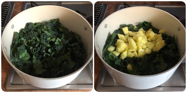 Deixe fritar por alguns instantes, depois adicione a couve, as batatas e uma pitada de sal.
