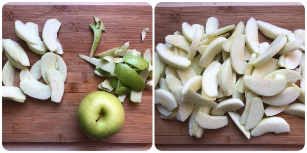 Lave quatro maçãs verdes, descasque-as, retire o miolo e corte em fatias.