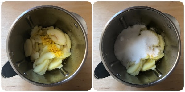 Quando as maçãs estiverem frias, transfira-as para um mixer junto com todo o seu líquido de cozimento.