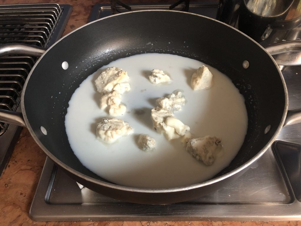 Enquanto isso, coloque o gorgonzola em pedaços em uma grande caçarola junto com o leite e derreta-o em fogo baixo, esmagando-o com as costas de uma colher de pau.