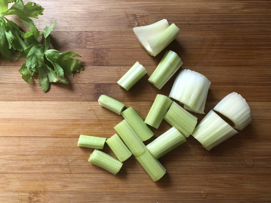 Remover as folhas dos talos de aipo, lavá-los bem em água corrente e cortá-los em pedaços.