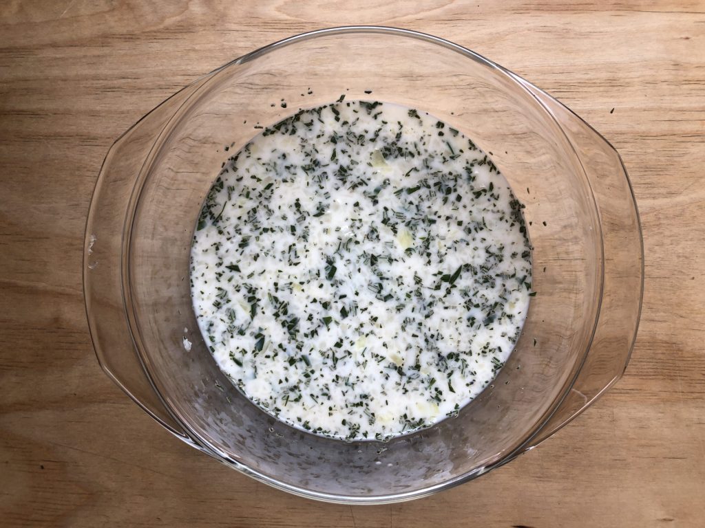 • Despeje o leite em uma tigela e tempere com algumas pitadas de sal e uma generosa quantidade de pimenta preta. Descasque o alho e a cebola e pique-os finamente junto com as folhas de um ramo de alecrim e as folhas de um punhado de salsinha. Em seguida, adicione essa mistura ao leite.